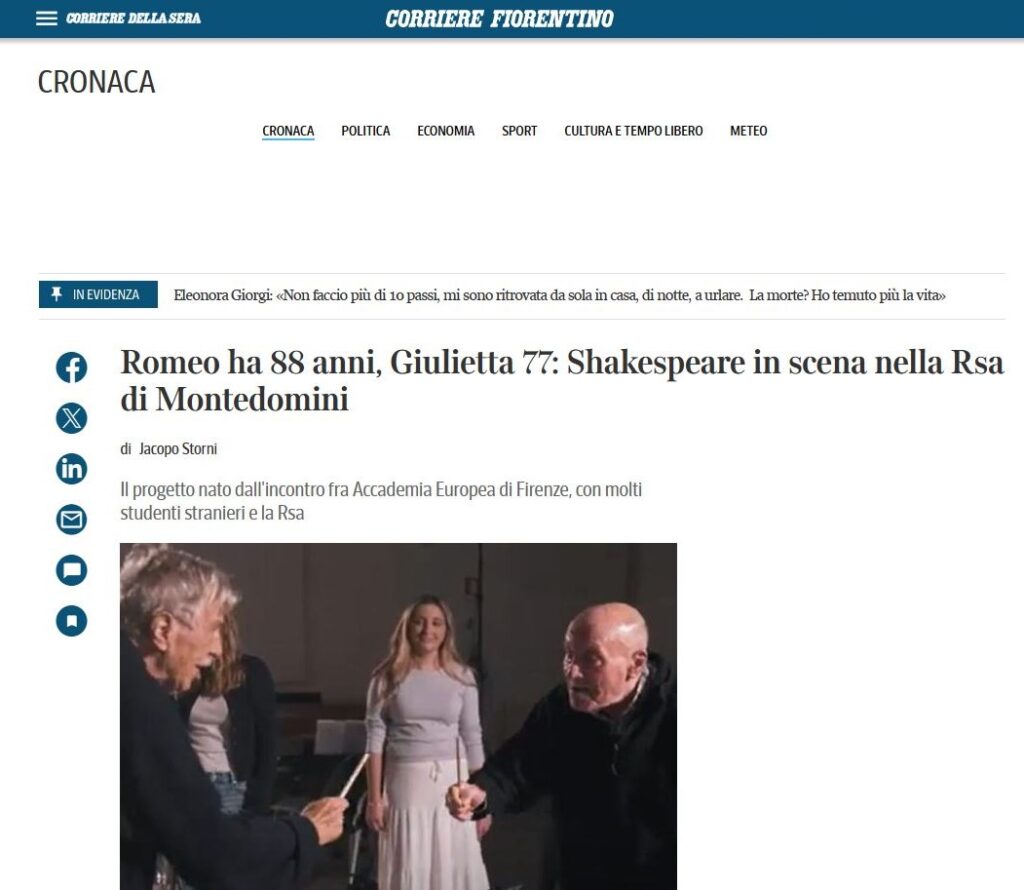 “Shakespeare in scena nella RSA di Montedomini”: gli anziani sono i protagonisti in Romeo e Giulietta insieme agli studenti e agli insegnanti di Accademia Europea di Firenze – Scuola di Arte, Lingua e Cultura italiana: ne parlano sul Corriere Fiorentino.
